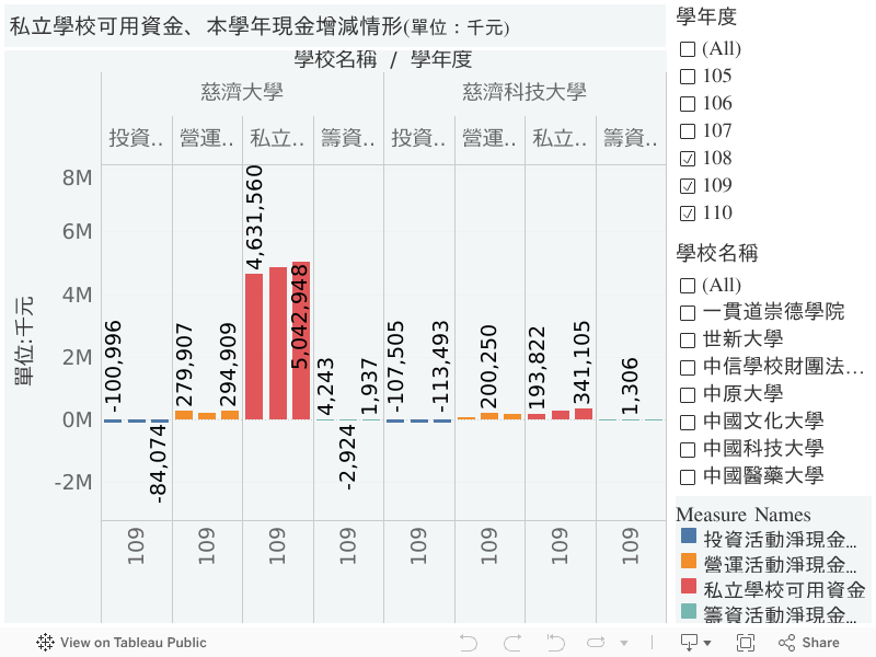 | 資料閱讀說明 | 1. 短期可用資金如為負值,表示學校短期內無可自由運用之資金,學校如有投資活動(如:購置固定資產)與融資活動(如:償還債務)之資金需求,須仰賴未來各學年度營運活動所產生之現金結餘或附屬機構盈餘撥充學校基金以支應校務營運所需,如上開資金不足以挹注,學校恐須處分固定資產或透過舉借債務等方式因應。2. 本學年現金(含銀行存款)增減情形小計數如為負值,表示學校該學年度營運活動所產生之淨現金,不足以支應該學年度之投資活動(如:購置固定資產)與融資活動(如:償還債務)所需,須仰賴學校歷年滾存之現金支應,又上開資訊僅表達學校ㄧ個學年度之現金增減情形,如該校當學年度有興建或處分不動產、增加附屬機構投資或舉借債務等,皆會使現金異常增減,爰應參酌歷年資料作綜合評估。3. 學校單項財務指標欠佳,並不表示學校整體財務狀況異常,仍應配合學校歷年財務報表之資訊及非財務資訊(如:註冊率)作綜合判斷。 |